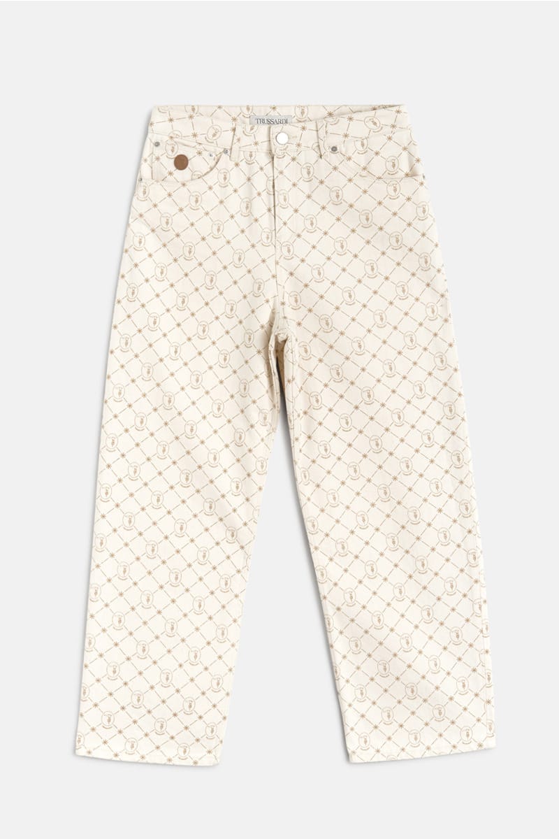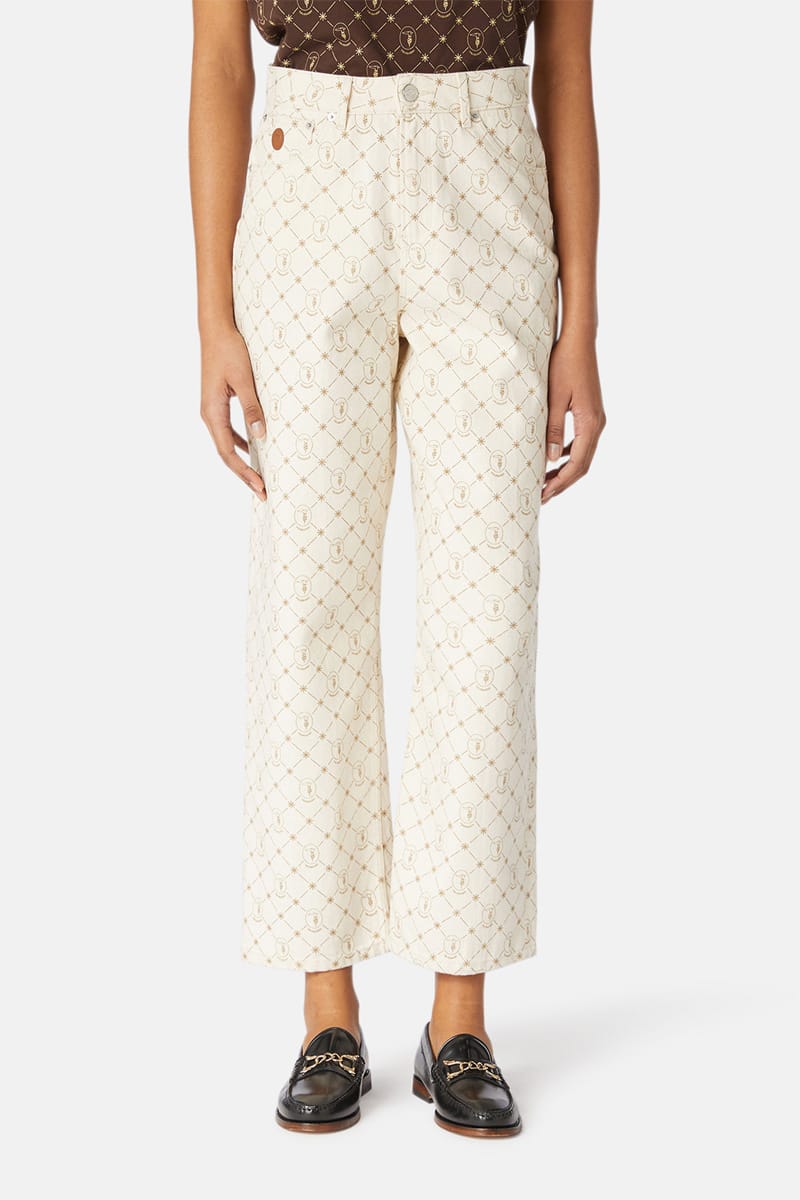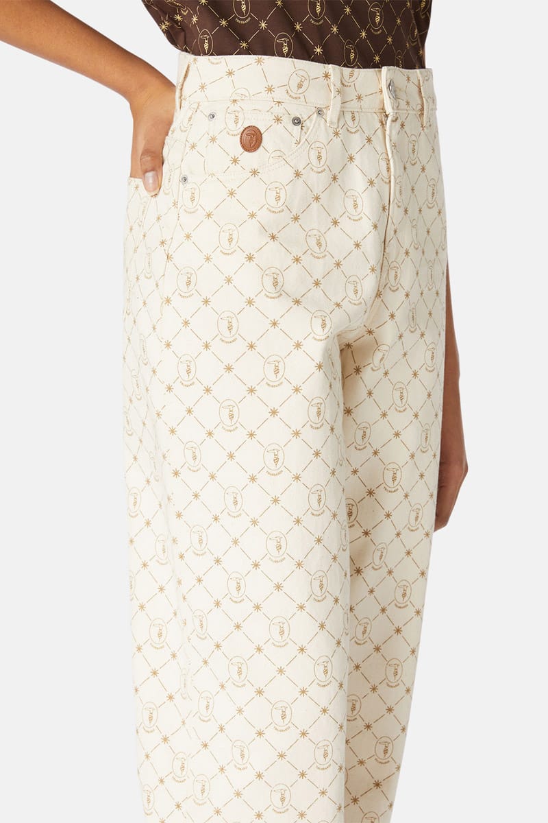 These high-waisted relaxed-fit 5-pocket jeans come in cotton denim. The all-over monogram print and tan oval patch on the watch pocket add embellishment. Contrasting stitching and metal rivets. Zip and tack button. This garment has a loose, tapered fit and the model is wearing a IT size 40 (26 inch)