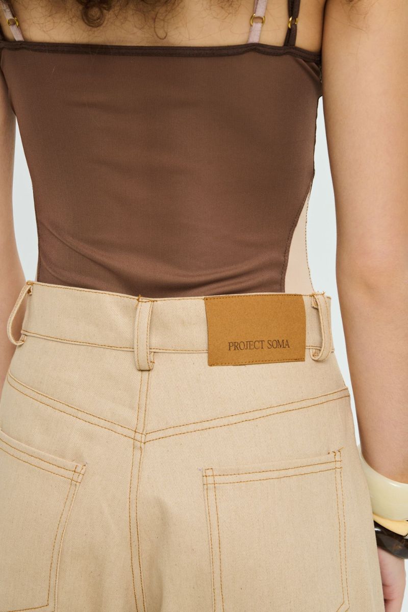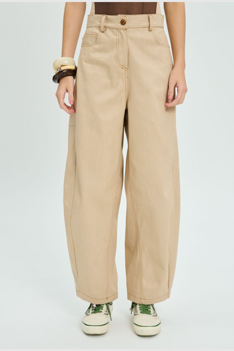 Το PROJECT SOMA Balm Beige Pants κατασκευάζεται από χρωματιστό bull denim ύφασμα. Barrel παντελόνι με διακοσμητικές ραφές.